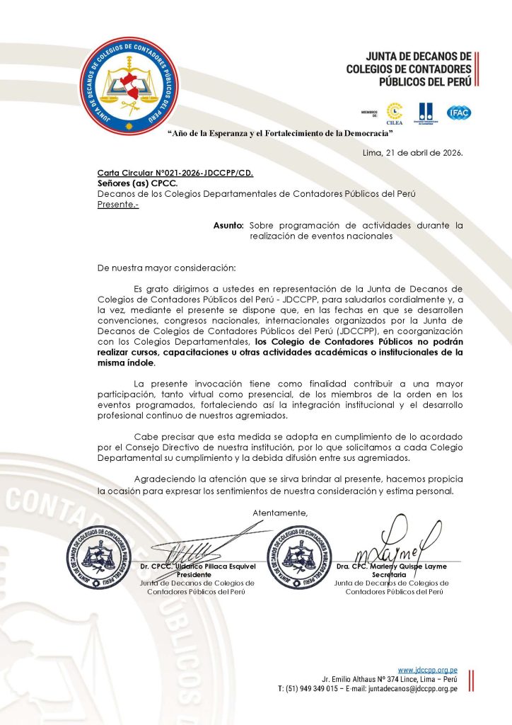 Inicio Comunicados Junta de Decanos Junta de Decanos de Colegios de Contadores Públicos del Perú COMUNICADOS CARTA DE LA JUNTA DE DECANOS A LOS COLEGIOS DEPARTAMENTALES DEL PERÚ Otros Comunicados SINEACE OFICIALIZA SEGUNDO ESTÁNDAR DE COMPETENCIA PARA LA EMISIÓN DEL INFORME O DICTAMEN PERICIAL CONTABLE.Ver comunicado Aquí SINEACE OFICIALIZA NUEVO ESTÁNDAR DE COMPETENCIA PARA DIRIGIR EL CUMPLIMIENTO TRIBUTARIO DE LAS ENTIDADES.Ver comunicado Aquí EVENTOS CONTABLES NACIONALES 2026 – JDCCPPVer comunicado Aquí